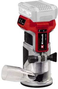 Cette affleureuse Einhell de 18 V a une vitesse max de 30 000 tr/min pour une pince de serrage de Ø6-8 mm.
