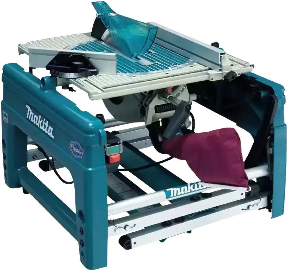 Pour finir, cette scie sur table Makita est équipée de quatre pieds repliables, ce qui évite d’avoir à transporter un piétement supplémentaire.
